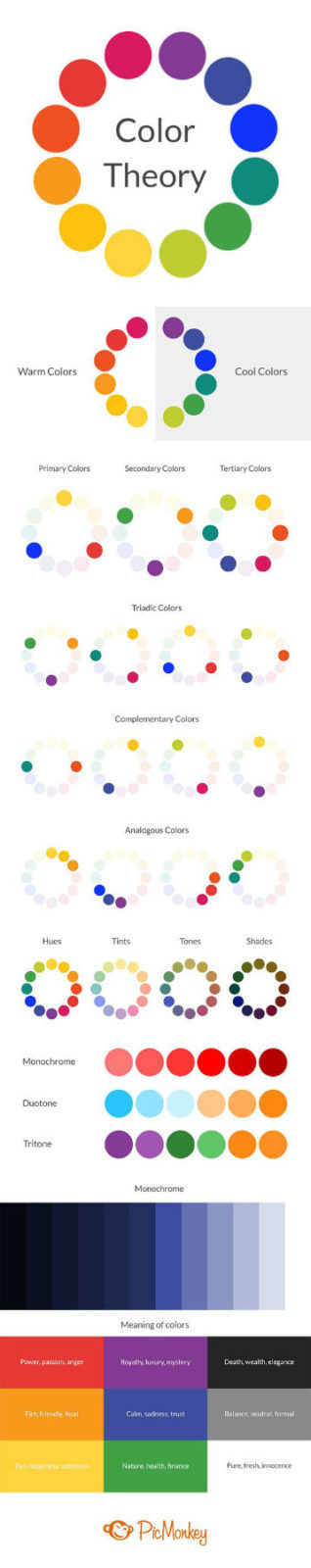 Chọn màu phối màu phù hợp cho các phối cảnh diễn họa mặt đứng kiến trúc với độ cao kiến trúc, nội thất, ngoại thất, bày trình chiếu, brochure và các poster là một trong những công việc thường xuyên và rất quan trọng đối với các 3D artist. Và công việc này cũng không hề đơn giản với đôi khi chúng ta sẽ bị rối bởi có vô vàn sự lựa chọn mà ta không biết đâu là phối màu phù hợp, hiệu quả nhất. Tuy nhiên có một số nguyên lý căn bản về màu sắc mà bất kì ai cũng cần nắm vững để lựa chọn đúng phối màu cho dự án của mình. Những nguyên lý cơ bản đó thường bao gồm: Lý thuyết về màu sắc (color theory, ví dụ đâu là mà cơ bản primary color, đâu là màu thứ cấp secondary color, màu tam hợp, tứ hợp, vòng tròn màu color wheel là như thế nào,...); Màu đơn sắc (monochrome) là gì? Ngoài ra, bạn cũng cần có hiểu biết về Tâm lý học đối với các sắc màu khác nhau, chẳng hạn, màu nào tạo ra sự thư giãn và yên tĩnh, màu nào làm tăng sự tập trung, màu nào có tính chất kích thích, năng động? Kết hợp tất cả các hiểu biết của bạn về những khía cạnh trên, bạn sẽ lựa chọn được những phối màu (color scheme) tốt nhất cho thiết kế của mình. Trước tiên, bạn hãy xem hình minh họa phía dưới do PicMonkey tạo ra để mô tả ngắn gọn về Lý thuyết màu sắc, từ đó bạn sẽ hiểu được cách thức mà các màu phối kết, pha trộn với nhau ra sao.